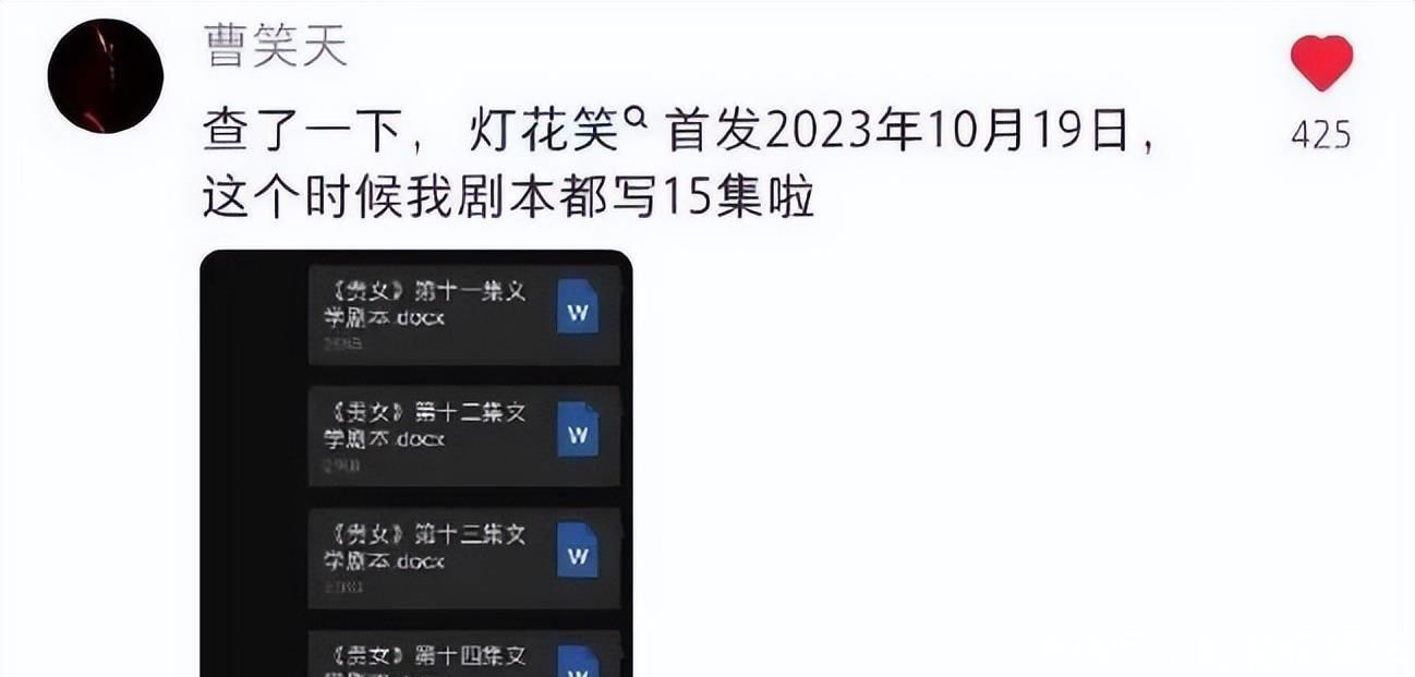 面对质疑,《雁回时》编剧曹笑天在社交网络上澄清了争议。他写道:“查了一下,灯花笑首发2023年10月19日,这个时候,我剧本都写15集啦!”为了证明清白,他还晒出自己的稿子截图,意思是时间上来不及抄袭!